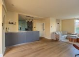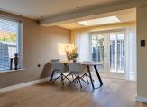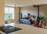 De moderne keuken staat in open verbinding met de uitgebouwde woon-/eetkamer, voorzien van lichtinval aan drie zijden en openslaande deuren naar de achtertuin. Stucwerk op de muren en plafonds is gecombineerd met een eikenhouten vloer, witte plinten en inbouwverlichting. Het zitgedeelte is aan de voorzijde, bij de houtkachel, en bij het eetgedeelte zorgt een grote lichtkoepel voor extra lichtinval.
