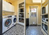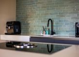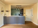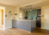 Blikvanger in de keuken zijn de groene tegeltjes op de wand, die goed passen bij de grijze keuken (2019) met kookeiland. Deze keuken heeft veel bergruimte en de inductie kookplaat met afzuiging, de vaatwasser, combi-oven en koelkast zijn ingebouwd. De bijkeuken met spoelbak en lichtkoepel biedt ruimte aan de wasmachine, droger en een koel-/vriescombinatie.
