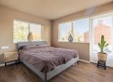 Aan de achterzijde zijn twee slaapkamers, waarvan een met een inbouwkast en een deur naar het platte dak. Deze kamer, met grote ramen aan twee zijden, is in gebruik als master bedroom. De naastgelegen kamer is nu de werkkamer en aan de voorzijde is de kinderkamer.