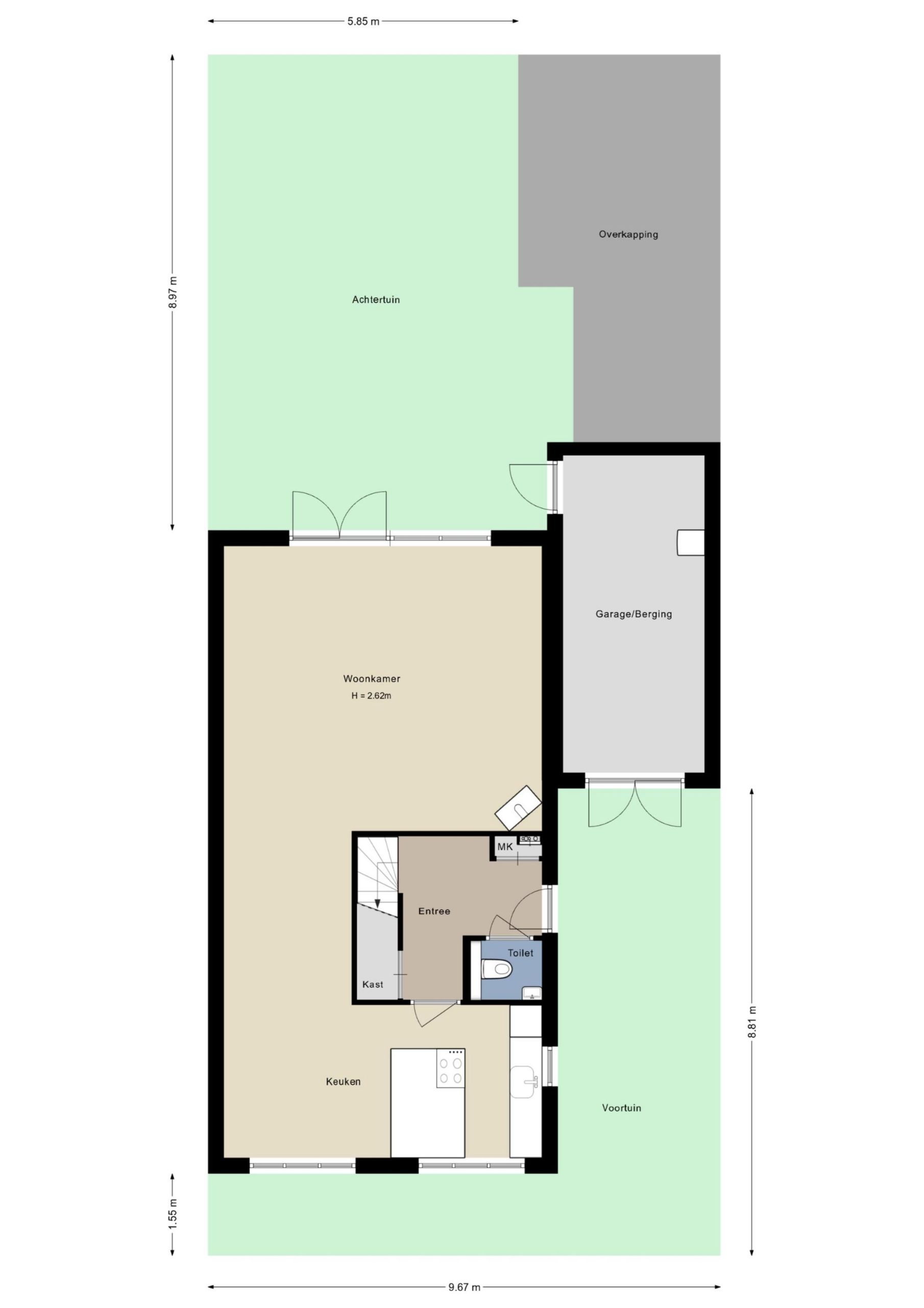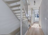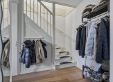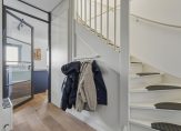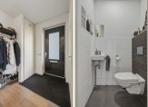 Aan het einde van de oprit is de overdekte entree, met de voordeur en dubbele deuren naar de garage/berging. Achter de voordeur is de fraaie hal, met een zwarte stalen woonkamerdeur als blikvanger. Naast de meterkast is een garderobenis en aan de andere zijde is de toiletruimte, uitgevoerd in wit en antraciet. Erg handig is de ruime bergkast onder de trap voor de stofzuiger, schoenen en andere spullen.