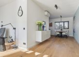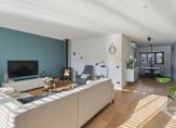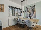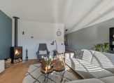 De royale woonkamer heeft een grote pui met openslaande deuren, voor een optimale verbinding met de tuin. De kozijnen zijn in trendy zwart geschilderd en de houtkachel is niet alleen een sfeermaker, het zorgt ook voor een aangename warmte. Er ligt in de hal en woonkamer een mooie geoliede eikenhouten vloer.