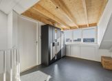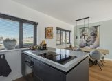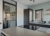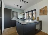 Aan de voorzijde is het eetgedeelte, vlak naast de keuken. Er hangt een airco-unit, die kan koelen en verwarmen, en er is genoeg plek voor een 6-persoonstafel. De zwarte keuken (2022) met kookeiland heeft niet alleen de juiste looks, maar ook alle benodigde apparatuur voor de kook- en bakliefhebber: een inductie kookplaat met afzuiging, een Quooker (kokend, koud en bruisend water), vaatwasser, combi-oven, koelkast, vriezer en een wijnkoelkast.