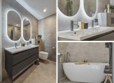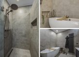De luxe badkamer (2022), uitgevoerd in grijs en wit, is ingedeeld met een vrijstaand bad, een inloopdouche, wandcloset en een badmeubel met twee wastafels. Alles klopt, van de zwarte accenten tot de spiegels met verlichting. Aan de andere zijde van de hal is een berging, met een raam in de zijgevel.