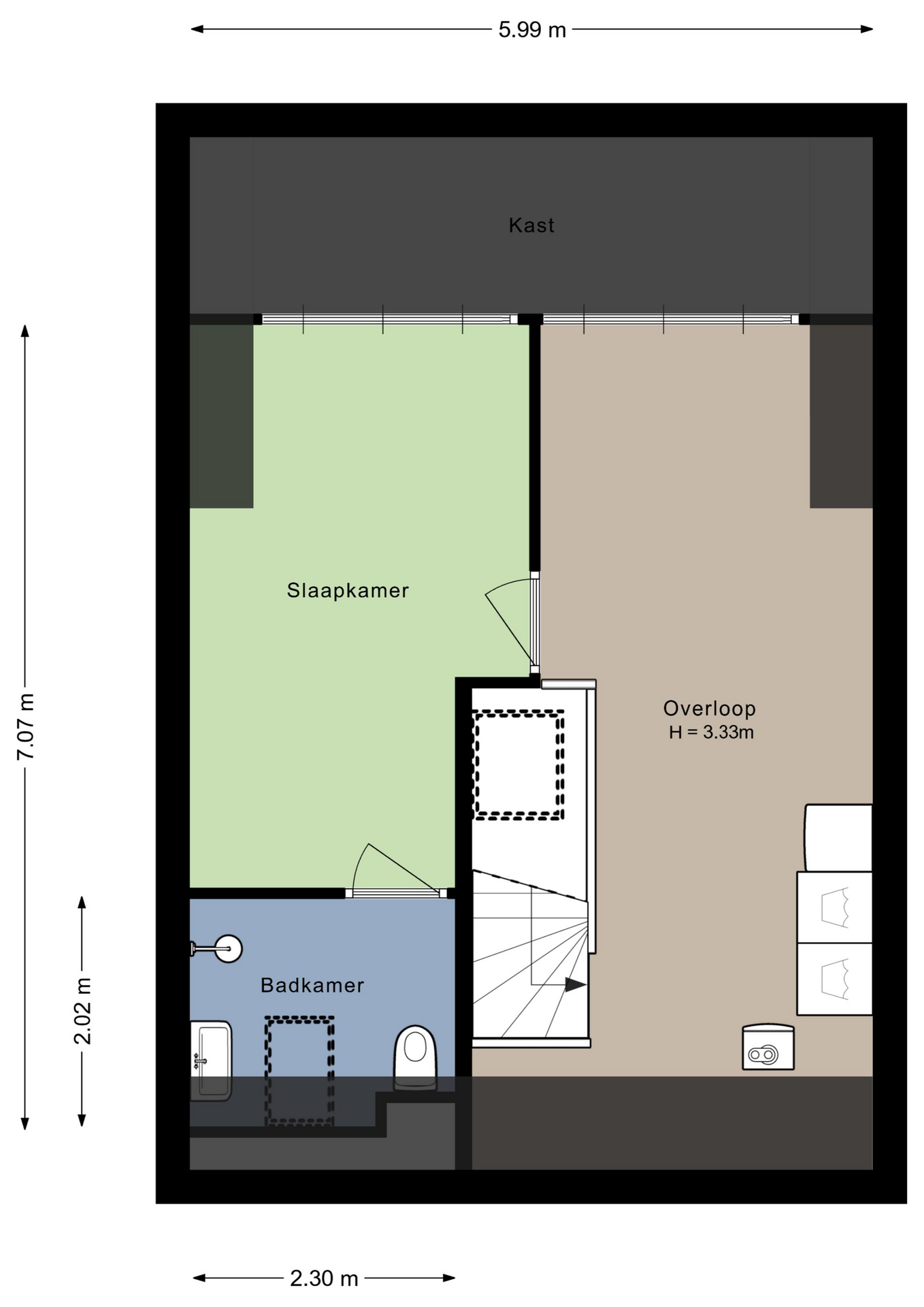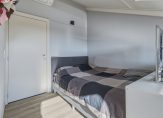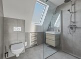 Wat een ruimte is er op deze verdieping, met een brede dakkapel aan de achterzijde. Er is een slaapkamer met badkamer gerealiseerd, perfect voor een thuiswonende zoon of dochter. Ook in deze slaapkamer hangt een airco-unit, die kan koelen en verwarmen. De badkamer is ingedeeld met een inloopdouche, een badmeubel met wastafel en een wandcloset.