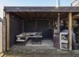 De aangebouwde garage/berging heeft dubbele deuren naar de oprit en een deur naar de tuin. Er is genoeg plek voor de (kinder)fietsen en het tuin-/klusgereedschap. In het verlengde van de garage/berging is een groot, overdekt terras gebouwd.