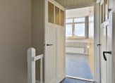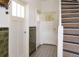 In de hal zie je, net als in de rest van de woning, fraaie details die zorgen voor karakter en sfeer. Voorbeelden zijn de wandtegels, paneeldeuren, het hoge ornamentenplafond en de prachtige tegelvloer. Links in de hal is de toiletruimte en achter een van de deuren is een trap naar de wijn-/provisiekelder.