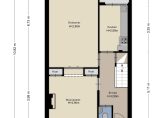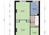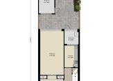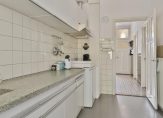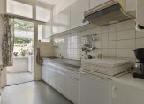 In de dichte keuken staat een eenvoudige wandopstelling met een afzuigkap. De rest van de apparatuur is los geplaatst en de spoelbak is, net als het aanrecht, van granito. In het verlengde van de keuken is een bijkeuken, met toegang tot de tuin. Kies je voor de huidige indeling of voeg je beide ruimtes samen tot een heerlijk ruime keuken?