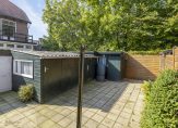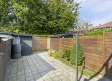 Vanuit de keuken loop je de achtertuin in, gesitueerd op het noordwesten. Aan de linkerzijde staan twee bergingen voor opslag, de fietsen en de hobbyist. De rest van de tuin is grotendeels bestraat en in de hoek van de tuin is een poort naar de steeg. Een pluspunt is de vrije ligging aan de achterzijde, want je kijkt naar vele prachtige bomen die horen bij een villa aan de Deventerweg.