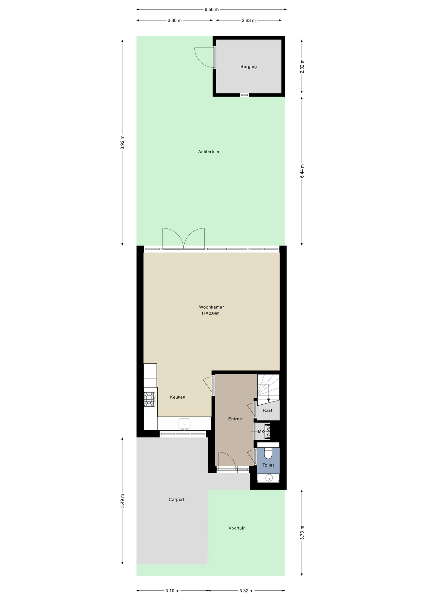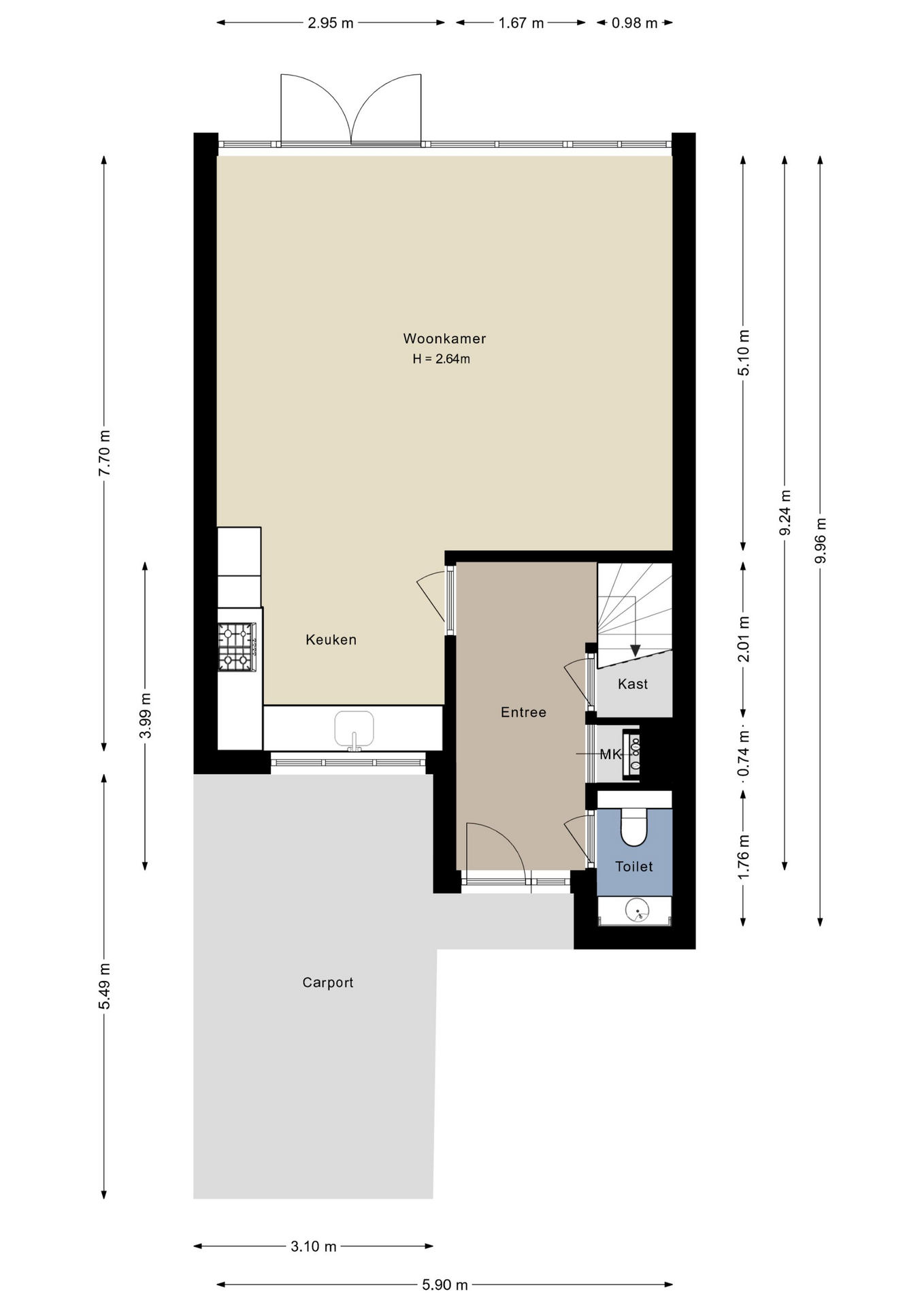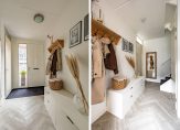 Nooit meer zoeken naar een parkeerplek, want je kunt parkeren op eigen terrein. Vervolgens loop je, via de carport, naar de overdekte entree van dit fraaie huis. In de hal ligt, net als in de woonkamer en keuken, een stijlvolle visgraatvloer. Rustige kleuren bepalen de sfeer en via het raam naast de voordeur valt veel licht naar binnen. Rechts in de hal zijn de trapopgang, de meterkast en de toiletruimte met fonteintje.