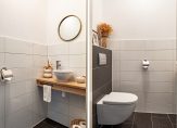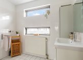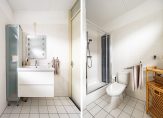 Twee brede ramen zorgen ervoor dat de badkamer heel licht en ruimtelijk is. Een groot deel van de wanden is betegeld, net als de hele vloer. De ruimte is ingedeeld met een douche, toilet en een wastafelmeubel met grote spiegel. Ook is er een wasmachineaansluiting, maar de apparatuur is inmiddels verhuisd naar de tweede verdieping.