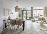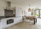 De bijna 6 meter brede, tuingerichte woonkamer is een heerlijke plek in huis. Niet alleen dankzij de sfeer en het hoge plafond, maar ook vanwege de grote ramen aan de zuidkant. Openslaande deuren zorgen voor een uitstekende verbinding met de tuin en de open verbinding met de keuken vergroot de ruimtebeleving.