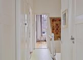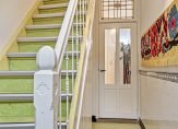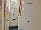 De hal met het bijna 3.40 meter hoge plafond is een kleurrijke verschijning, met diverse stijlelementen. Zo zie je een kleurrijk glas in loodraam, oude wandtegels, een rijk gedecoreerde trap en de voordeur met klassiek deurrooster. Achter de trap is een deur, die toegang geeft tot een trap naar de wijn-/provisiekelder.