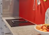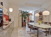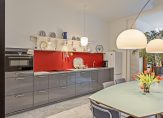 Op de begane grond heb je de beschikking over een grote, uitgebouwde woonkamer met open keuken. In een groot deel van de woonkamer en keuken ligt marmer op de vloer, met vloerverwarming, en in het achterste deel is een houten vloer gelegd. De ruimte is thans ingericht met een zithoek, eettafel en een werkruimte met uitzicht naar de tuin. Bewonder de hoge ramen die, samen met de lichtstraat en openslaande tuindeuren, voor veel lichtinval zorgen. Daarnaast beschikt de woonkamer over elektrische gordijnbediening. De moderne keuken in wandopstelling, uitgevoerd in hoogglans grijs, heeft een ingebouwde inductie kookplaat met afzuiging, een Quooker kraan en een combi-oven.