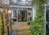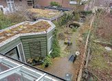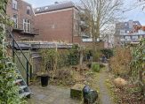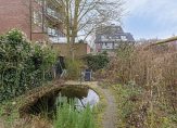 Een van de pluspunten is de zeer ruime achtertuin op het noordoosten. Het grote terras is op woonkamerniveau en een paar treden lager is de siertuin, met gevarieerde beplanting en een vijver. Als de boom straks weer in blad staat, dan zie je het appartementengebouw nauwelijks.