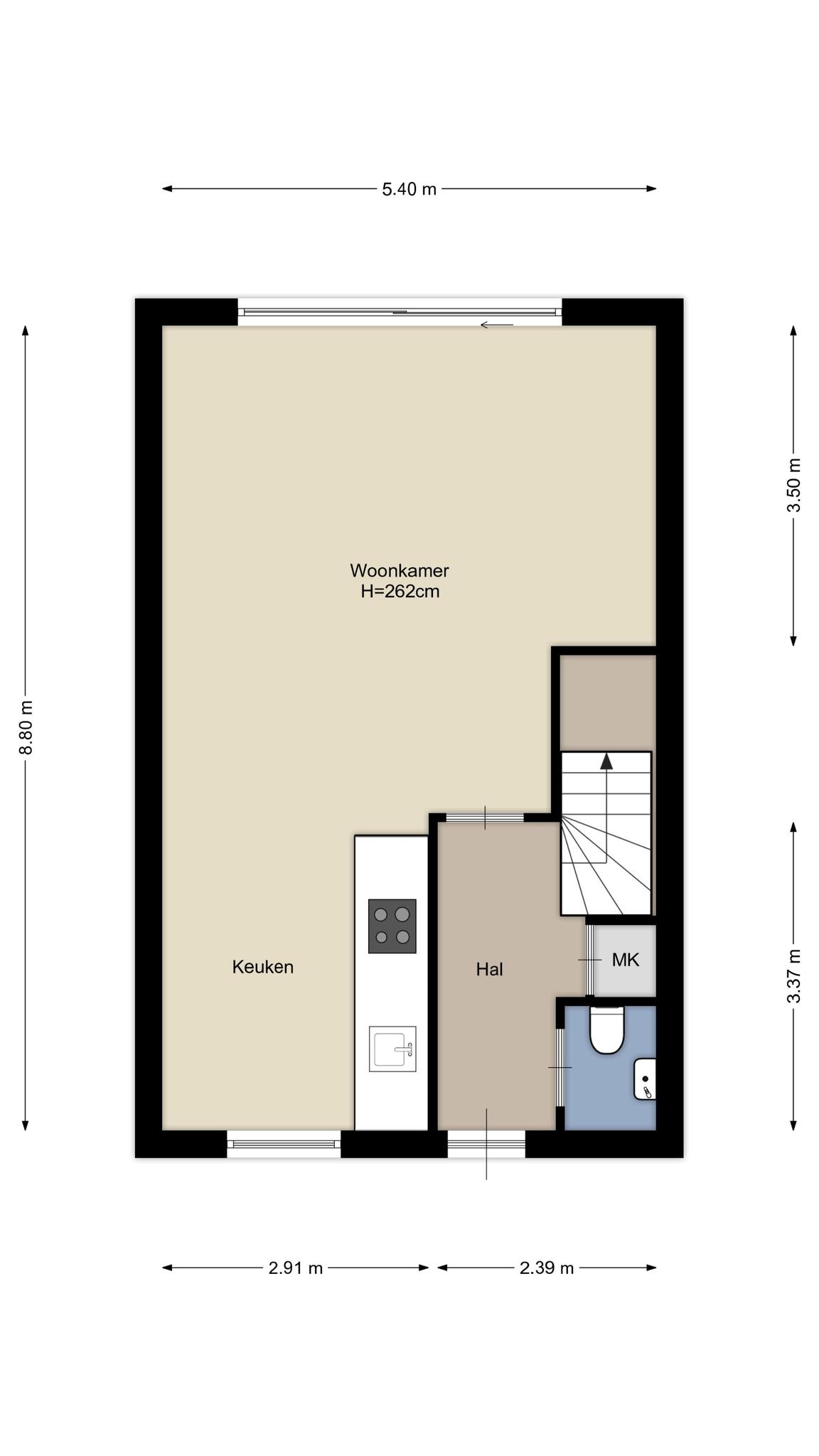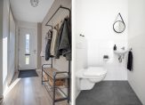 Erg fijn is de groenstrook aan de voorzijde, waardoor de parkeerplaatsen en de weg op afstand liggen. Via het voetpad loop je naar de voordeur en vervolgens de hal in, met de trap naar de eerste verdieping. Aan de rechterzijde is de toiletruimte met fonteintje, uitgevoerd in wit en grijs. In de hal, woonkamer en keuken ligt laminaat op de vloer.