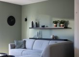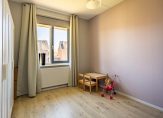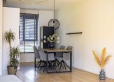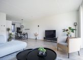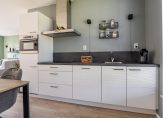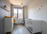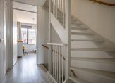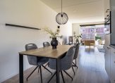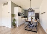 De tuingerichte woonkamer heeft een grote schuifpui naar de tuin en, dankzij de ligging op het westen, veel lichtinval. Een ander pluspunt is de trapkast en de open verbinding met de keuken, met plek voor de eettafel. De keukenopstelling is uitgevoerd in een lichte kleur, met een grijs aanrechtblad en diverse inbouwapparatuur: een inductie kookplaat, afzuigkap, vaatwasser, koelkast en een combi-oven. De kleur op de muren zorgt, net als in de woonkamer, voor een huiselijke sfeer.