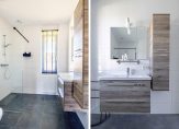 De ruime badkamer is ingedeeld met een inloopdouche, wandcloset en een wastafelmeubel. De lades en de hoge kast bieden veel bergruimte en de glazen douchewand versterkt het gevoel van ruimte.
