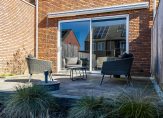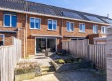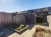 De achtertuin, gesitueerd op het westen, is ingedeeld met twee terrassen en twee borders, aangeplant met lavendel en siergrassen. In de houten berging is ruimte voor de fietsen en er is een poort naar de steeg.