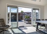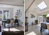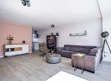 In de aanbouw gaat de aandacht direct naar de aanbouw met ramen tot vloerhoogte, openslaande tuindeuren en een dakraam in het schuine dak. De aanbouw is de perfecte plek voor een grote eettafel en een heerlijke fauteuil, waardoor de rest van de woonkamer ingericht kan worden als zit- en tv-gedeelte.