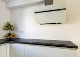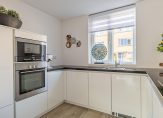 Aan de voorzijde is de keuken, die in 2018 is vernieuwd. Erg handig is de trapkast, voor de stofzuiger en andere spullen. De lichte U-opstelling is fraai afgewerkt met een zwart composiet blad en alle benodigde apparatuur is ingebouwd: een inductie kookplaat, afzuigkap, vaatwasser, oven, magnetron en een koel-/vriescombinatie. Strakke lijnen en rustige kleuren bepalen de sfeer in deze fijne keuken, waar een kook- en bakliefhebber wel raad mee weet.