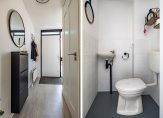 De hal heeft, net als de rest van de woning, veel sfeer. Aan de linkerzijde zijn de toiletruimte met fonteintje en de trap, bekleed met zacht tapijt. In de hal ligt, net als in de woonkamer en keuken, een laminaatvloer. Er is ook een sparing gemaakt voor een grote mat en de afwerking met witte plinten is fraai.
