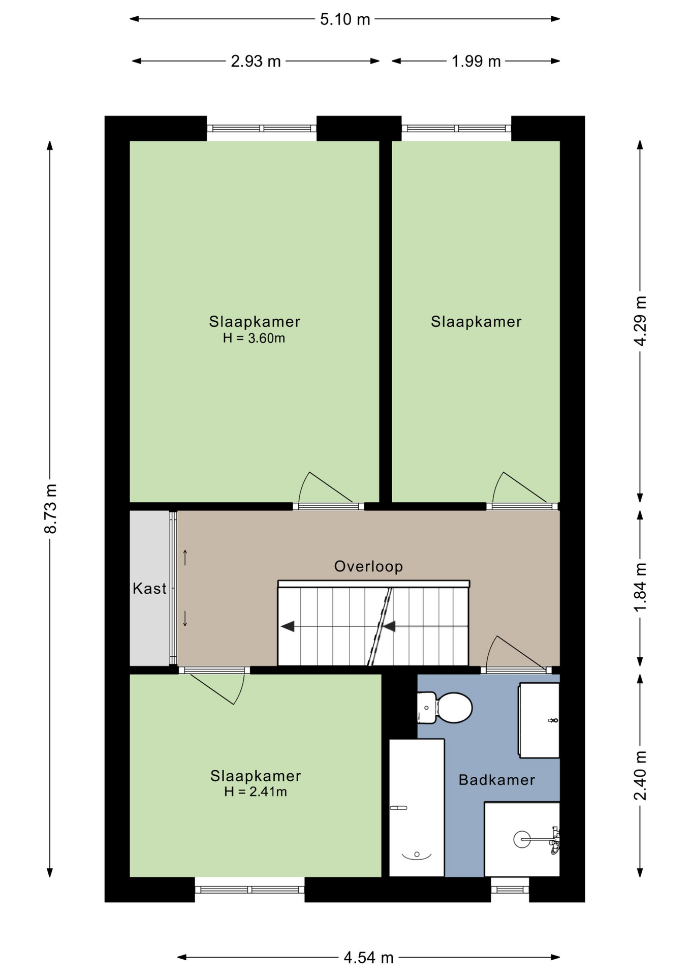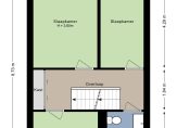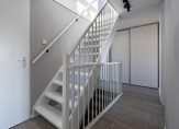 Dit type woning heeft een fijne indeling op de eerste verdieping, met een ruime overloop over de hele breedte van het huis. Hier zie je de witte, open trap naar de tweede verdieping en een grote schuifdeurkast.