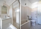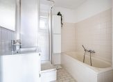 De badkamer, met een raam in de voorgevel, is ingedeeld met een ligbad, aparte douche, wastafelmeubel en een tweede toilet. Tussen het bad en de douche hangt een hoge kast aan de muur die, samen met de lades van het wastafelmeubel, genoeg bergruimte biedt.