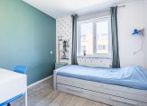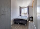 Er zijn slaapkamers aan de achterzijde, waaronder de master bedroom, en de derde slaapkamer is aan de voorzijde. In de slaapkamers aan de achterzijde zie je het hoge, schuine dak en in de kleine kamer hangt een airco-unit (koelen en verwarmen).