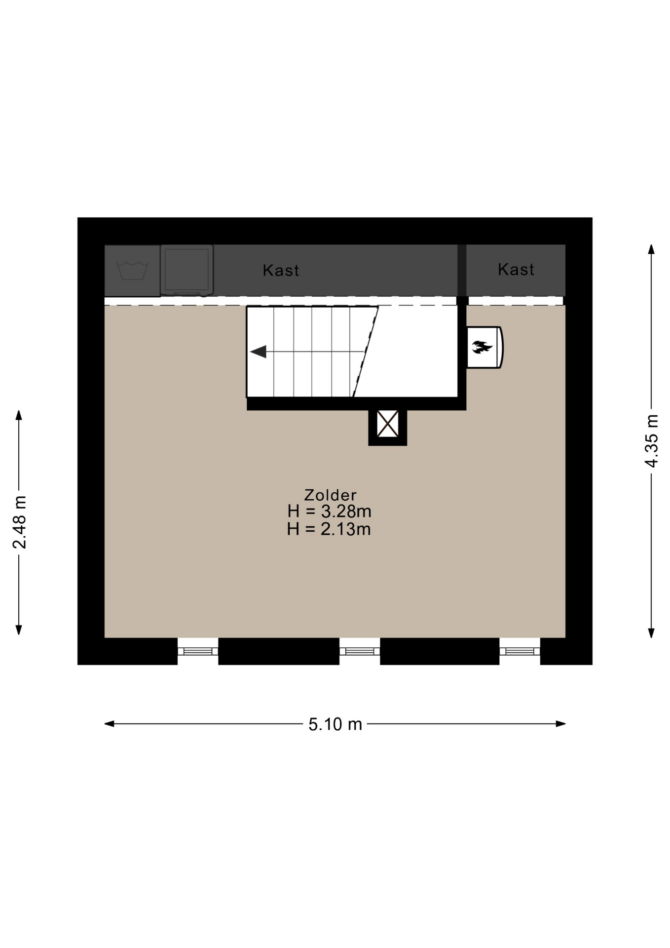 Een vaste trap geeft toegang tot een multifunctionele kamer die nu als werkkamer, sportruimte en wasruimte wordt gebruikt. De maximale hoogte is maar liefst 3.28 meter en ook hier hangt een airco-unit. Het is mogelijk om deze kamer te splitsen in een overloop/wasruimte en een aparte slaapkamer.