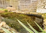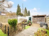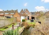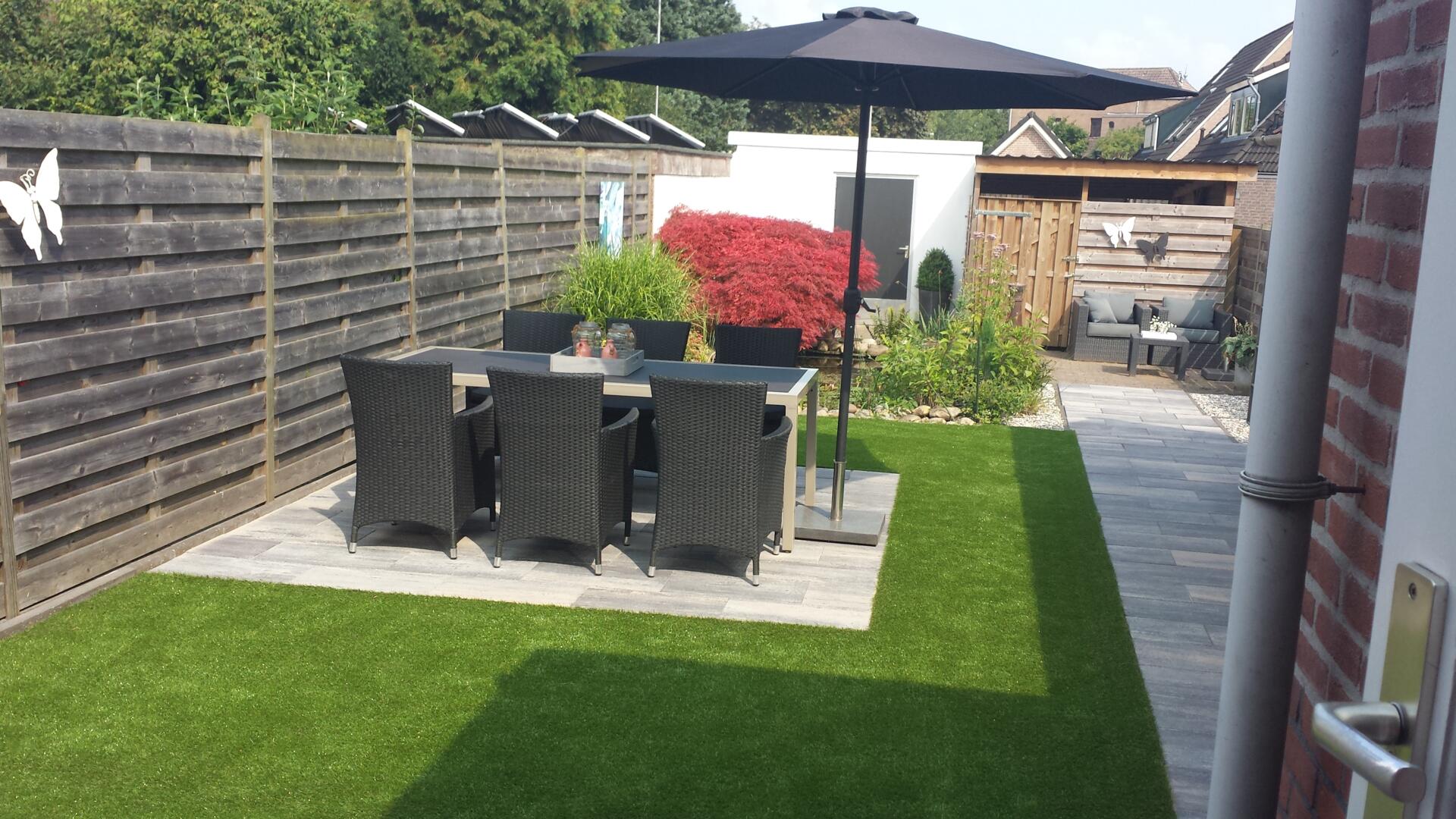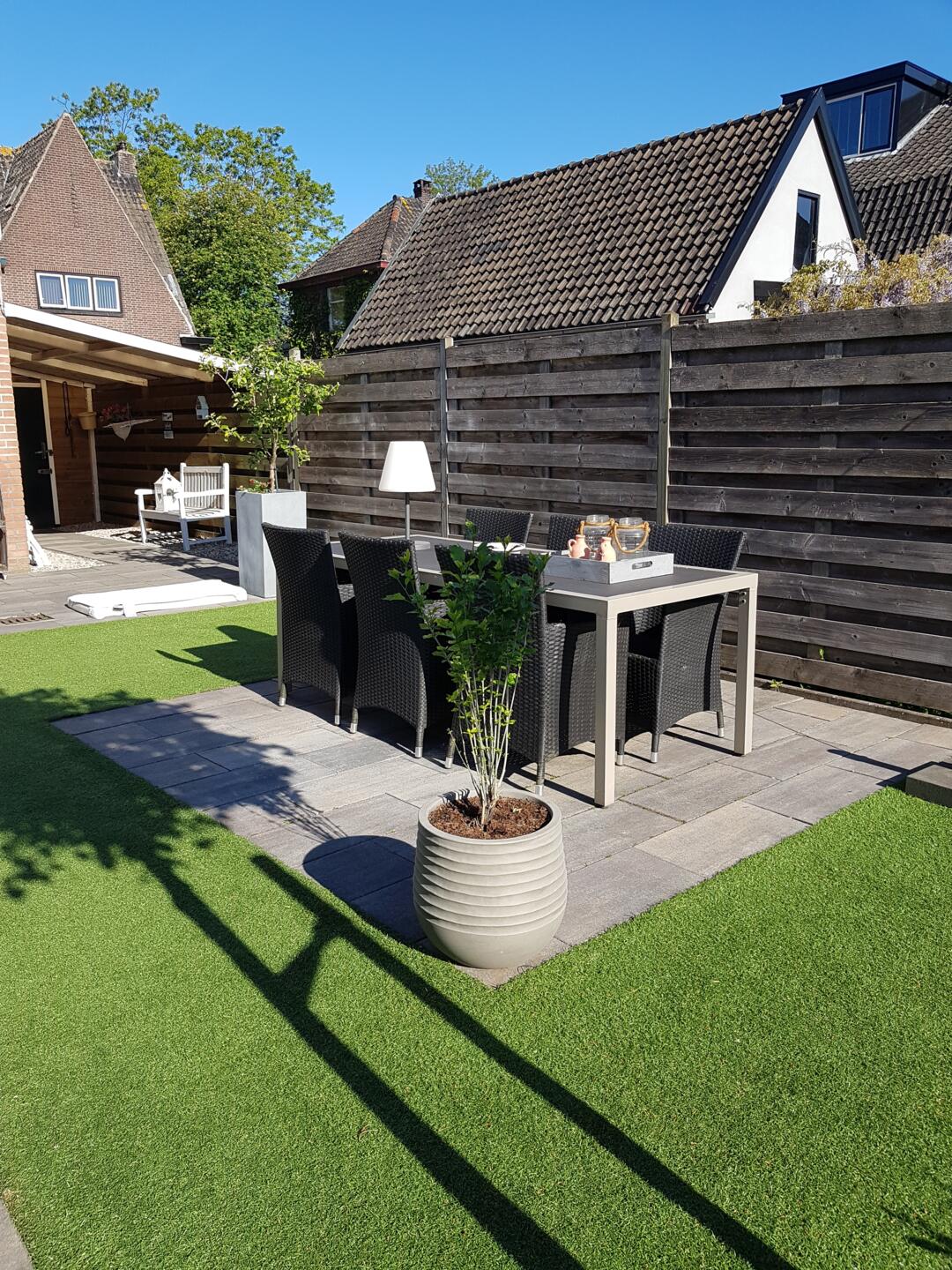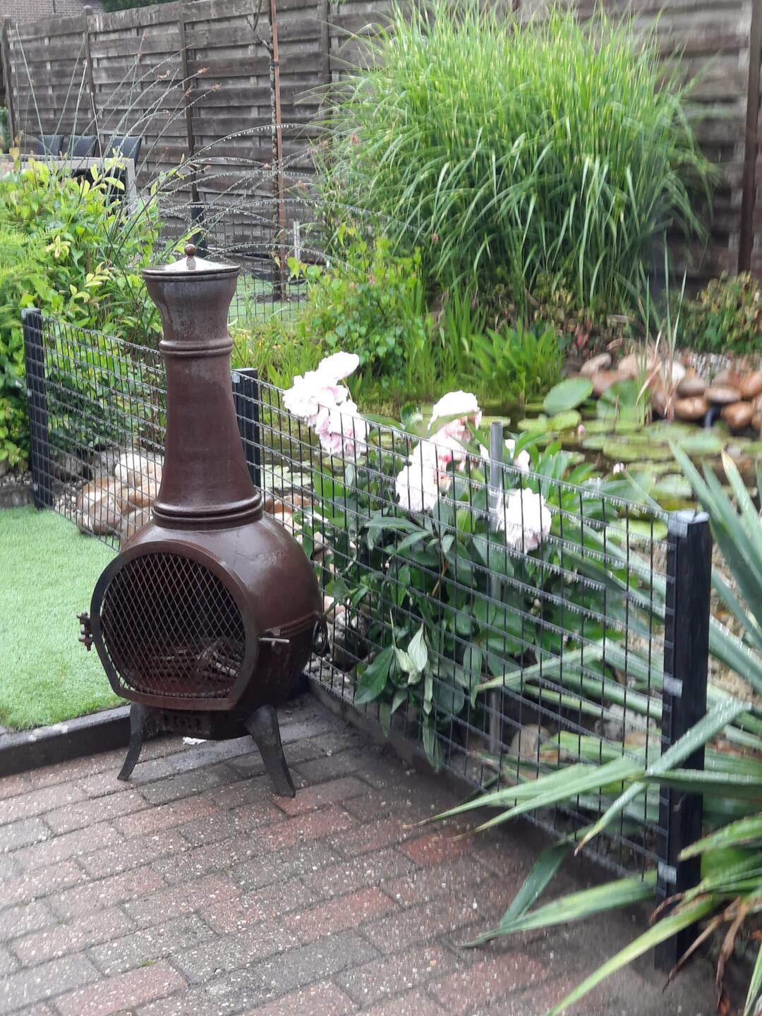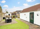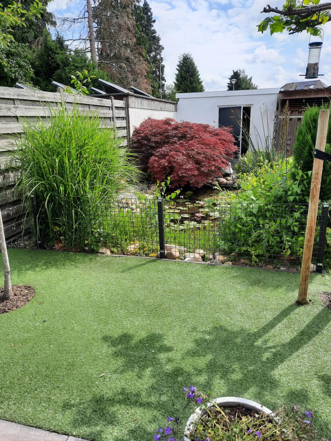 De diepe, onderhoudsvriendelijke achtertuin is gesitueerd op het oosten. Het terras wordt aan drie kanten omringd door kunstgras en naast de vijver is het tweede terras, waardoor je de hele dag in de zon kan zitten. De vissen in de vijver kunnen worden overgenomen, anders zorgen de huidige eigenaren voor een nieuwe plek.