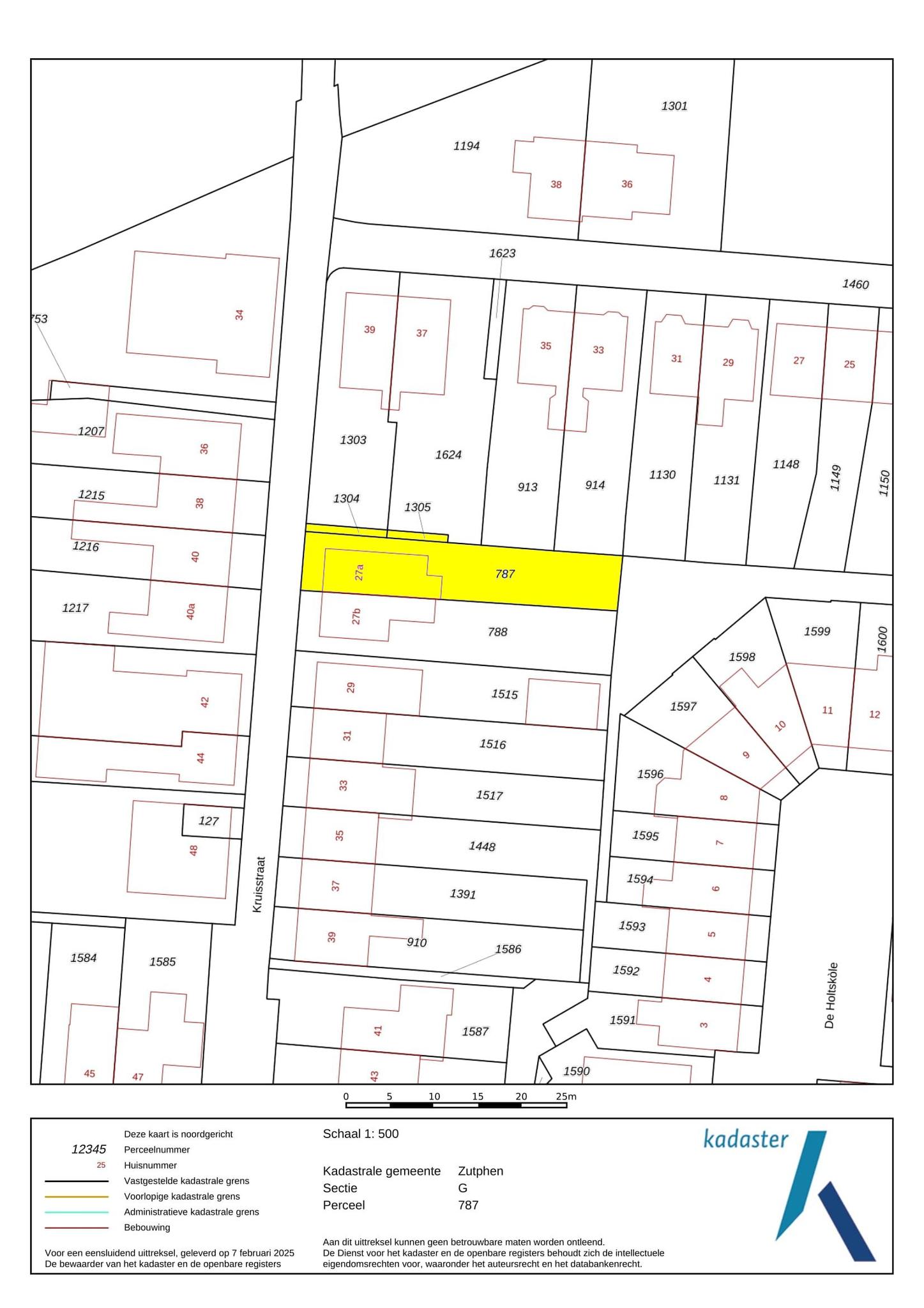 Vanaf de Kruisstraat kijk je naar de voortuin en oprit, die beiden zijn aangelegd met grind en tegels. Aan het einde van de oprit zie je een poort, die toegang geeft tot de overkapping en achtertuin.