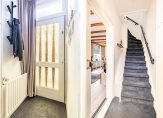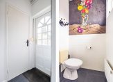 Parkeer je de auto op de oprit, dan loop je via de voortuin naar de fraaie entree. Kies je ervoor om de auto onder de carport te zetten, dan is de keukendeur de kortste route. Maar we gaan nu via de voordeur, die toegang geeft tot de hal. Op de vloer en trap ligt tapijt en aan de linkerzijde zie je een mooie schuifdeur, die toegang geeft tot de woonkamer.