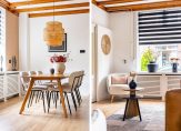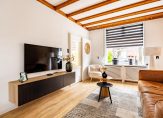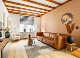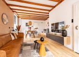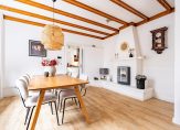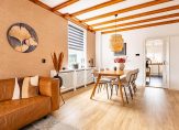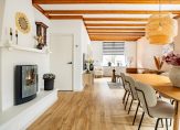 Wat een sfeer heeft de woonkamer, met lichtinval aan twee zijden en een stijlvol balkenplafond. De kleur van het behang past niet alleen bij de balken, maar ook bij de laminaatvloer. Andere fraaie elementen zijn de radiatorombouw en de schouw met plateau bij het eetgedeelte.