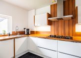 In de aanbouw zijn de keuken, badkamer en toiletruimte. Vanuit de keuken kijk je naar de tuin en de mooie hoekopstelling (2008) is voorzien van een houtlook aanrechtblad, achterwand en zijpanelen. Alle benodigde apparatuur is ingebouwd: een 5-pits gaskookplaat, afzuigkap, koel-/vriescombinatie, vaatwasser (circa 2022) en een magnetron (2025).