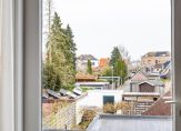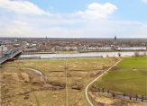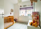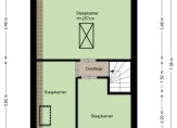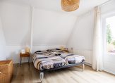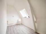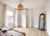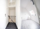 Volg de trap vanuit de hal, naar de overloop op de eerste verdieping. Boven het trapgat is een berging gemaakt en er ligt tapijt op de vloer. Verder zijn er drie slaapkamers, waarvan twee aan de voorzijde. Aan de achterzijde is de master bedroom, over de hele breedte van het huis, met een deur naar het platte dak. En als je goed kijkt, dan zie je in de verte de prachtige panden die aan de IJsselkade staan!