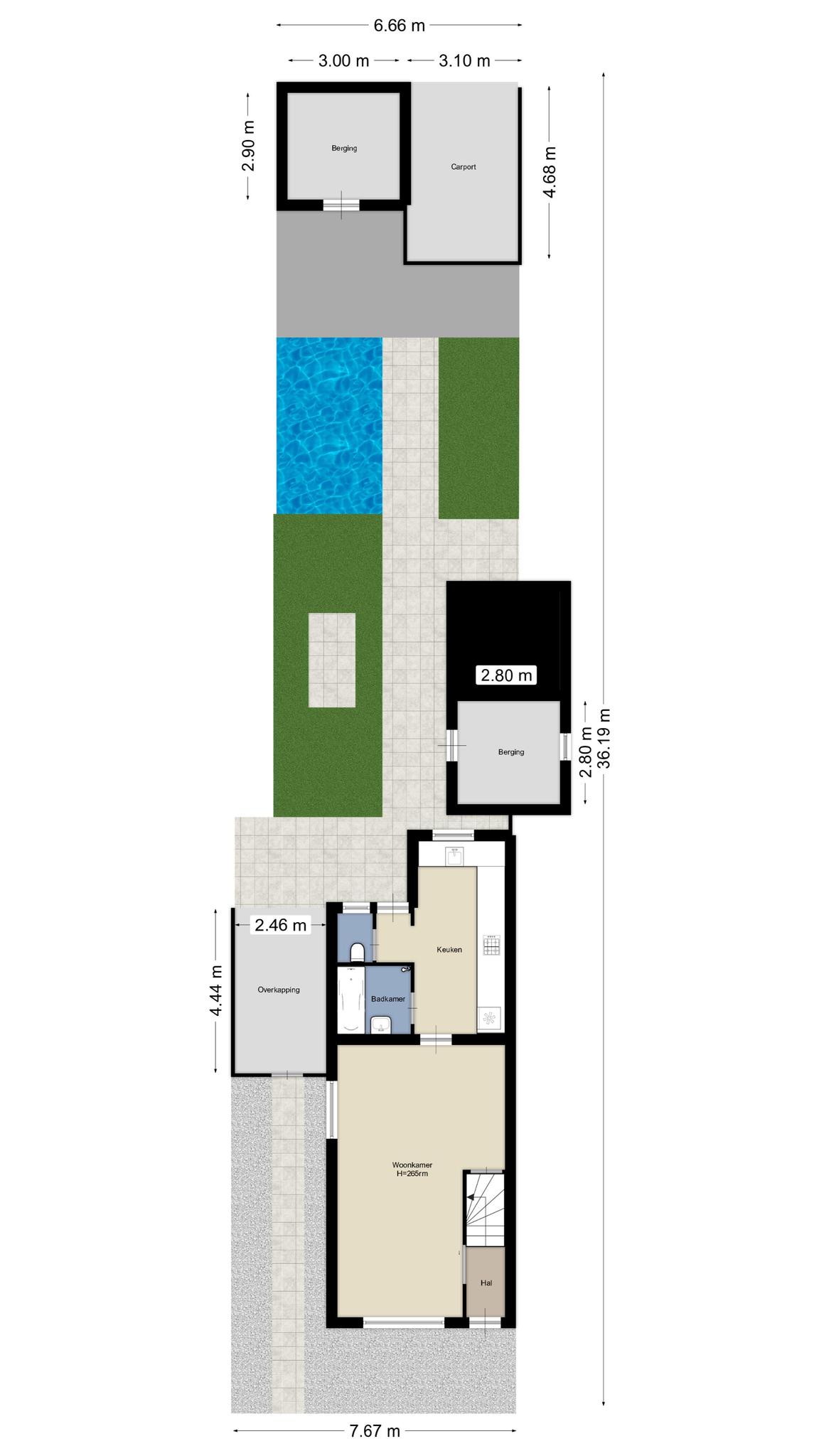 De berging is een fijne plek voor opslag en de carport, gebouwd in 2010, zorgt ervoor dat er voor een huishouden met twee auto’s genoeg parkeergelegenheid op eigen terrein is.