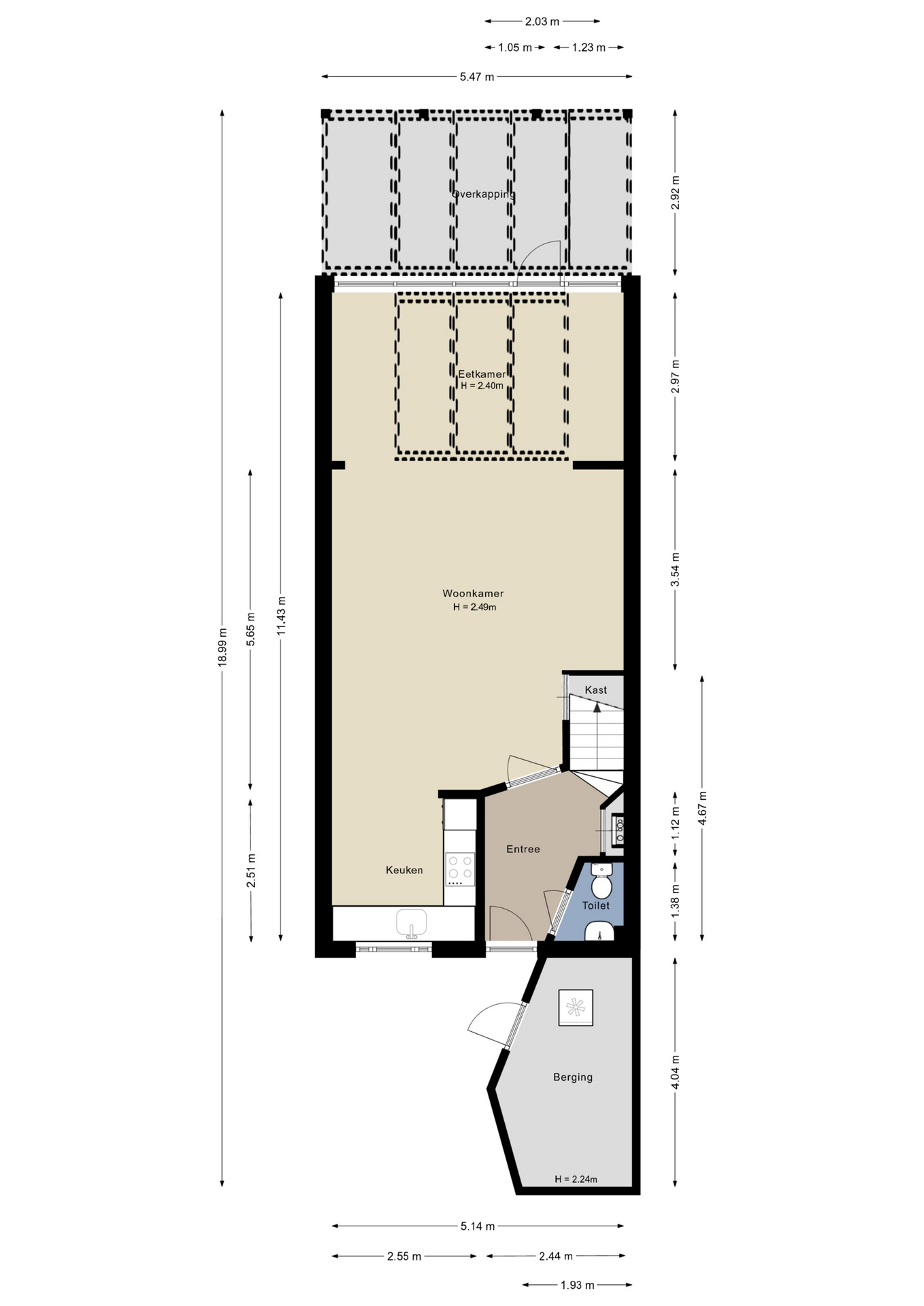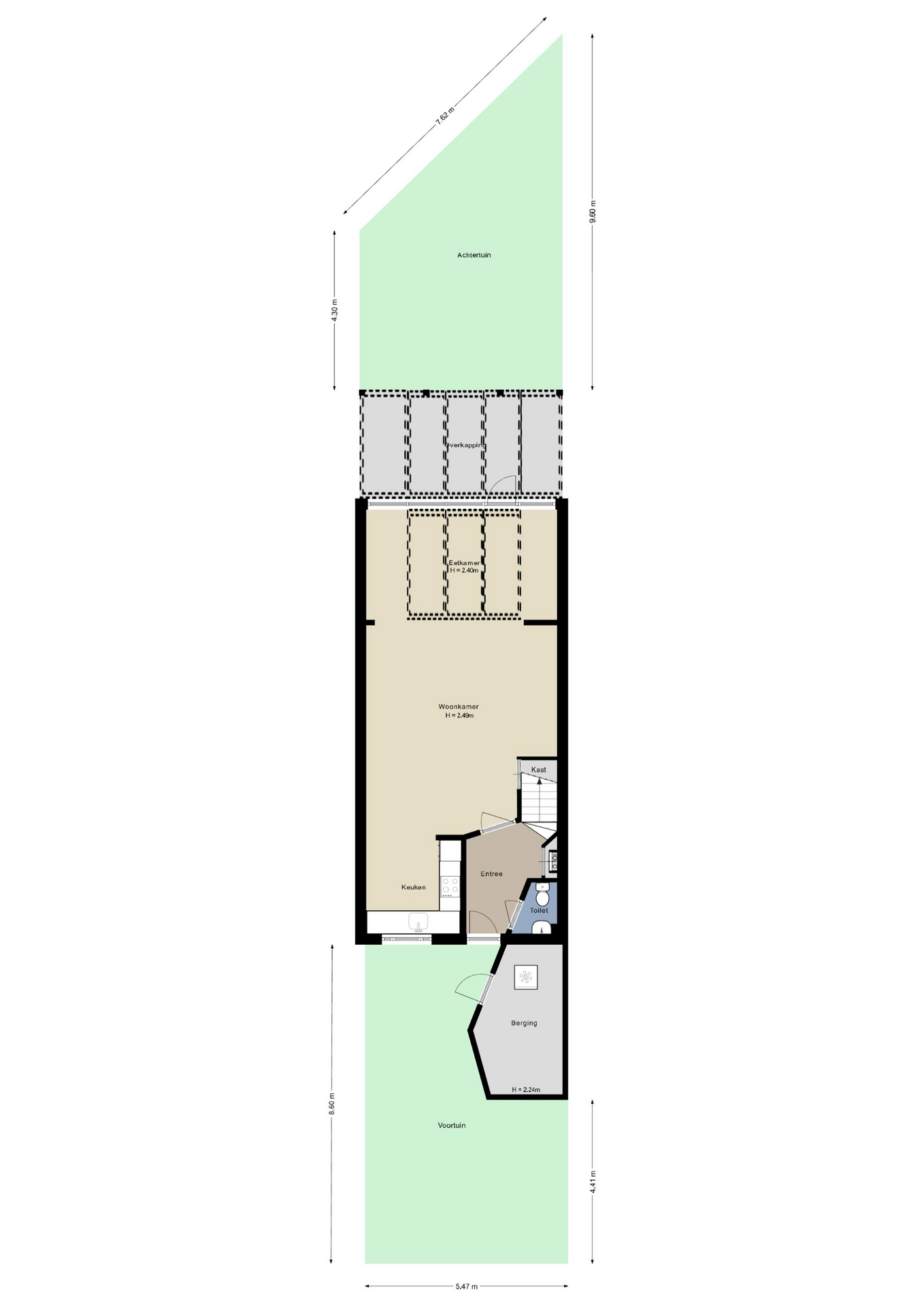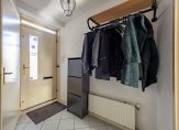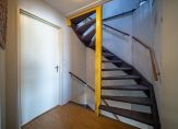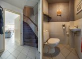 Via het autovrije pad en de voortuin loop je naar de overdekte entree van deze verrassend ruime woning. Hier zijn de voordeur en een deur naar de (fietsen)berging, voorzien van elektra. In de hal zijn de trapopgang, meterkast en de toiletruimte met fonteintje. De diagonaal gelegde tegelvloer ligt op de hele begane grond, met vloerverwarming in de woonkamer en keuken.