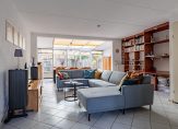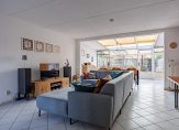 De aangebouwde serre zorgt voor veel lichtinval en extra ruimte in de woonkamer. Het oorspronkelijke deel van de woonkamer is ingericht als zitkamer met hobbyruimte, en de serre als eetkamer. Onder de trap is een handige bergkast en een deur in de serre geeft toegang tot de zonnige tuin met overdekt terras.
