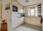 Aan de voorzijde is de keuken, waar een lichte hoekopstelling staat. Boven het aanrecht en het spoelgedeelte is verlichting ingebouwd en alle apparatuur is ingebouwd: een keramische kookplaat, afzuigkap, vaatwasser, koelkast en een combimagnetron.