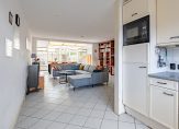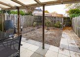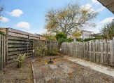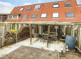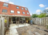 De serre geeft toegang tot het overdekte terras en de achtertuin, die op het zonnige zuiden gesitueerd is. Een groot deel van de tuin is bestraat en er is een achterom. Er staan enkele planten in de borders, maar er is nog genoeg plek om verder te vergroenen.