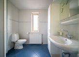 De badkamer, in wit en twee blauwtinten, heeft een royale vloeroppervlakte en een raam in de voorgevel. Aan de linkerzijde is de douche en de rest van de ruimte is ingedeeld met een toilet en een wastafel met planchet, spiegel en een hoge kast.