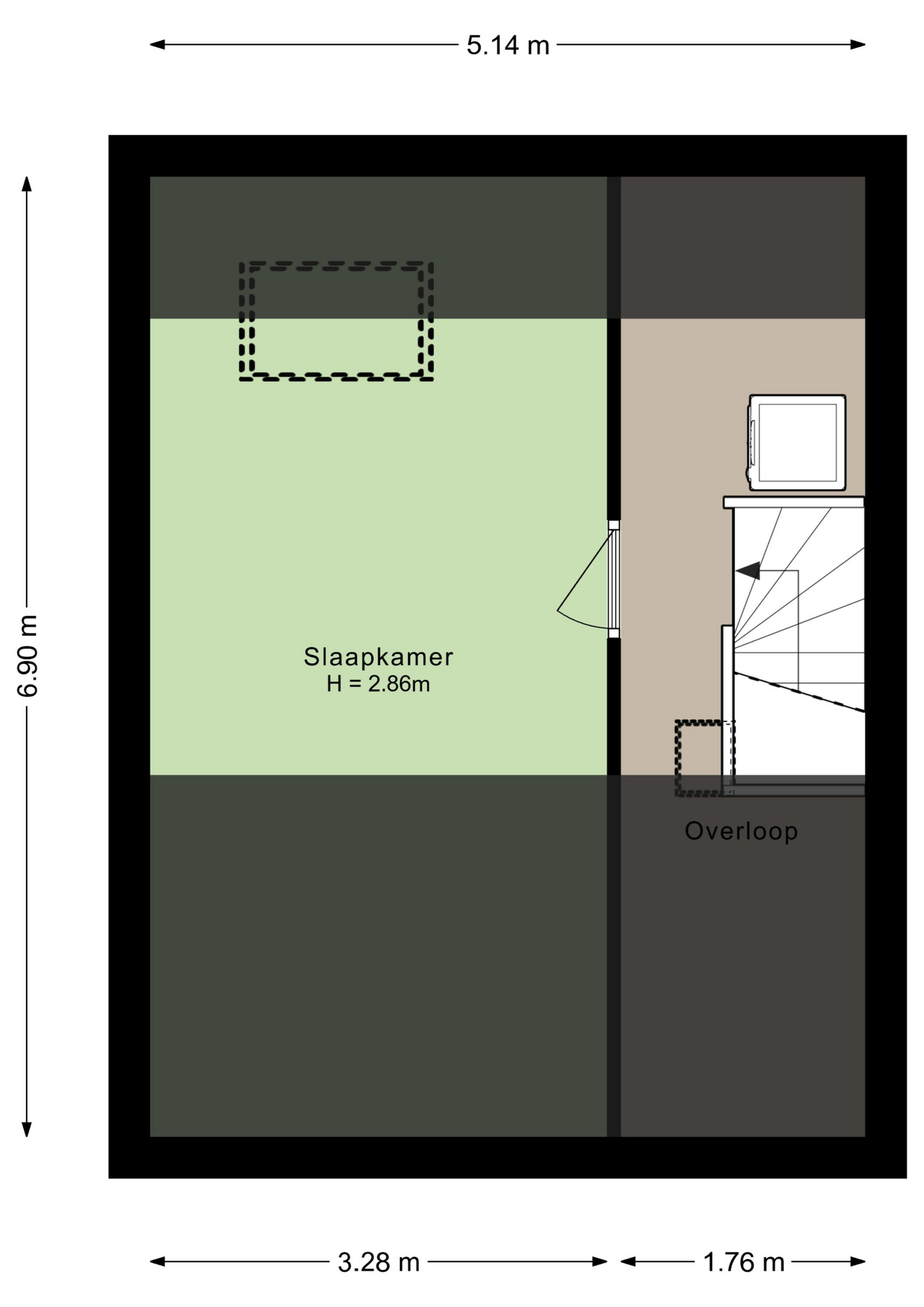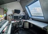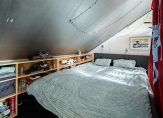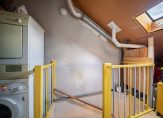 Een vaste trap geeft toegang tot de tweede verdieping, die ruimte biedt aan een overloop/wasruimte en een ruime slaapkamer. De slaapkamer is nu verdeeld in een slaap- en een muziekgedeelte.