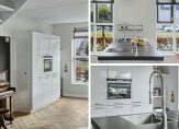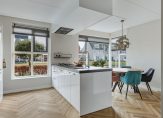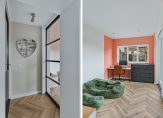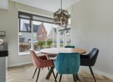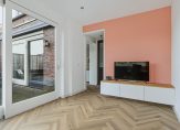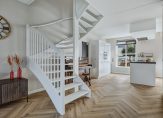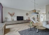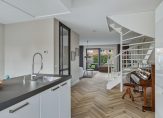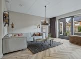 Een fraaie zwarte taatsdeur met glas verbindt de hal met de woonkamer en keuken, die samen meer dan 50 m2 zijn. Aan de achterzijde, bij de grote schuifpui, is het zitgedeelte en de keuken met eetgedeelte aan de voorzijde roepen het gevoel op van een woonkeuken. Lichte, warme kleuren bepalen de sfeer en dankzij de oost-westligging is het heel licht in huis.