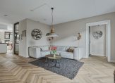 Ben je klaar om deze fantastische woning te gaan bekijken? Bij de oprit is de voordeur, die toegang geeft tot de hal. Je oog valt op de visgraatvloer, die op bijna de hele begane grond ligt. Onder deze vloer ligt heerlijke vloerverwarming, waardoor er geen radiatoren te zien zijn. Links in de hal is de toiletruimte, uitgevoerd met een wandcloset en een fonteintje.
