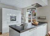 De keukenopstelling, met een kastenwand en een eiland, is het toonbeeld van strakke lijnen en heeft een dik, stoer aanrechtblad. De afzuiging is in het verlaagde plafond verwerkt en verder zijn er een gaskookplaat, vaatwasser (2023), combi-oven, koelkast en een vriezer. Zo is er alles wat je nodig hebt om lekker te koken, terwijl de rest van het gezin gezellig aan tafel zit.