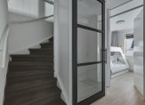 Aan het einde van de trap is een mooie, zwarte deur met glas. Deze zorgt ervoor dat er geen warmte vanaf beneden verloren gaat. Een ander voordeel is dat geluid wordt gedempt, waardoor de kinderen rustig kunnen slapen terwijl je met vrienden of familie aan het natafelen bent.