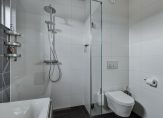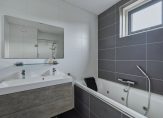 Niet alleen de slaapkamers, maar ook de badkamer is heel ruim. Onder het raam is het whirlpoolbad en verder zijn er een ruime inloopdouche, een wandcloset en een tweepersoons wastafelmeubel. Fraaie elementen zijn de kranen, het tegelwerk en de grote spiegel.