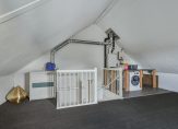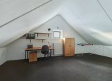 Met een vloeroppervlakte van circa 35 m2, exclusief bergruimte, en een nok van bijna 3.20 meter hoog kun je op deze verdieping nog twee (slaap)kamers en een wasruimte creëren. Nu is er een open ruimte, in gebruik als werkplek en berging. Verwarming is aanwezig, net als een raam in de zijgevel en een vaste trap naar de eerste verdieping.