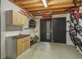 Bij het zitgedeelte is een doorgang naar een portaal, waar toegang tot de garage en een werk-/tv-kamer is. De garage heeft een maximale lengte van circa 5.30 meter en voorzieningen als elektra, een keukenblok met spoelbak, bergplanken en ook hier ligt vloerverwarming. Aan de achterzijde is de volledig geïsoleerde werk-/tv-kamer die, net als de woonkamer, een schuifpui naar de tuin heeft.