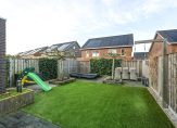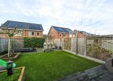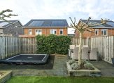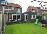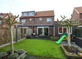 Twee grote schuifpuien zorgen ervoor dat de achtertuin, op het westen, goed bereikbaar is. De ruimte is ingedeeld met twee terrassen, kunstgras en verhoogde borders waarin recent gesnoeide bomen staan. Aan drie kanten staan houten schuttingen en boven het grote terras hangt een elektrisch bedienbaar zonnescherm. En als je vanuit de tuin naar omliggende woningen kijkt, zie je dat het plaatsen van een dakkapel mogelijk is!